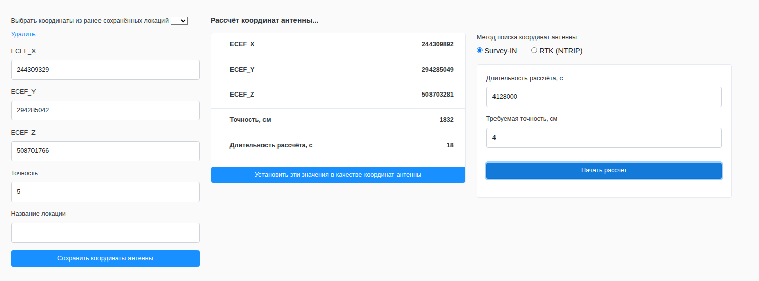 Далее будет необходимо ввести длительность (в секундах) и требуемую точность рассчёта (в сантиметрах) в соответствующие поля и нажать кнопку "Начать рассчёт". Рекомендуемая длительность 1-2 суток (86400-172800 секунд), точность - 4см. Точность установки антенны влияет только на абсолютное позиционирование, точность ровера относительно базы в RTK-режиме останется стандартной (1см+1см на каждые 10км удаления от базы) внезависимости от точности выставления координат антенны.