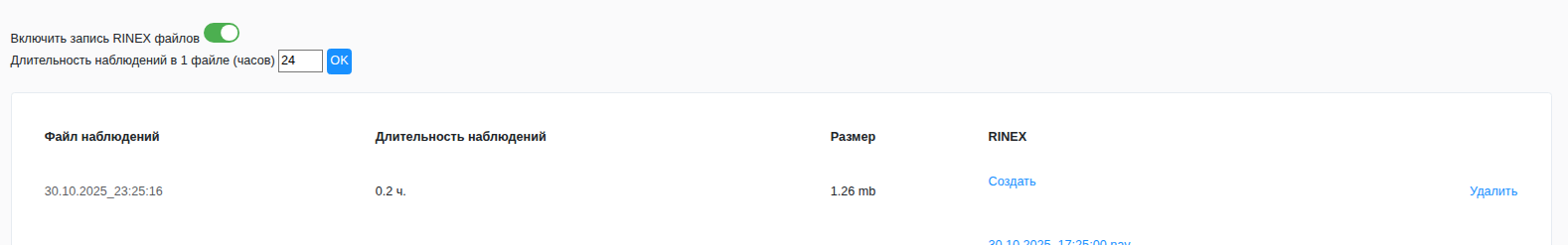 После того, как прошло 24 часа и файл наблюдений записан, нажмите ссылку "Создать" в столбце RINEX таблицы для генерации RINEX файлов.