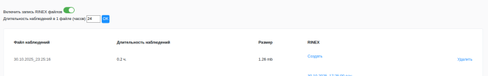 Установите длительность наблюдений в одном файле в 24 часа и нажмите кнопку "OK". Переведите ползунок "Включить запись RINEX файлов" в крайнее правое положение. После этого начнётся запись файлов наблюдений, которые будут отображаться в таблице. Запись файлов будет вестись непрерывно (в данном примере каждые 24 часа будет запускаться запись нового файла и окончание записи предыдущего). Поэтому после того, как координаты антенны настроены, запись RINEX файлов следует отключить , чтобы избежать переполнения памяти устройства.