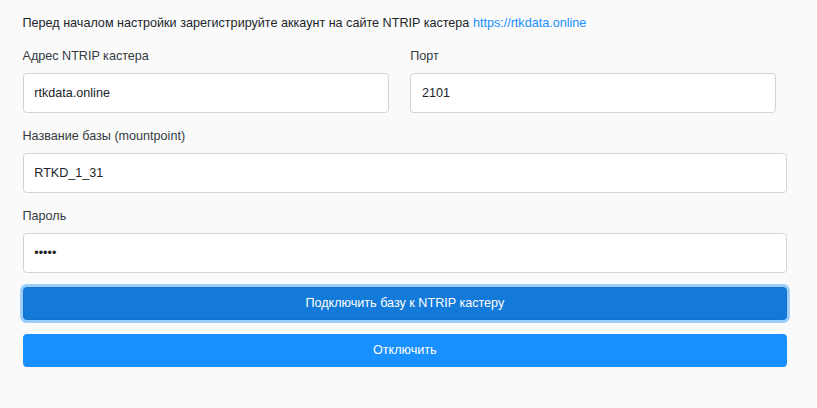 Нажмите кнопку "Подключить базу к NTRIP кастеру"
